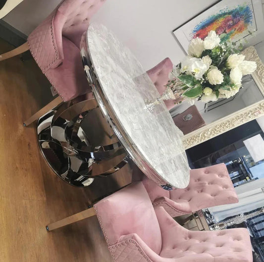 Chelsea 130x130cm Round Table With Pink Majestic Lion Knocker Chairs