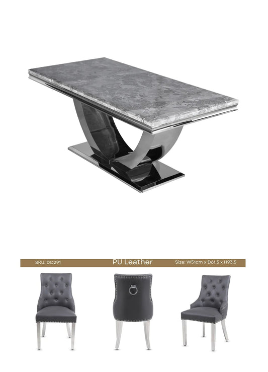 Louise Marble Dining Table With Valentino Dark Grey Lion Knocker Chairs
