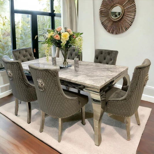Louis 150cm/180cm/200cm Grey Marble Dining Table With set of Lion Knocker Velvet Dining Chairs, Dark Grey