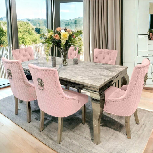 Louis 150cm/180cm/200cm Grey Marble Dining Table With set of Lion Knocker Velvet Dining Chairs, Pink
