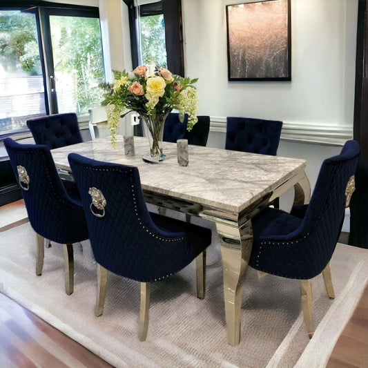 Louis 150cm/180cm/200cm Grey Marble Dining Table With set of Lion Knocker Velvet Dining Chairs, Blue