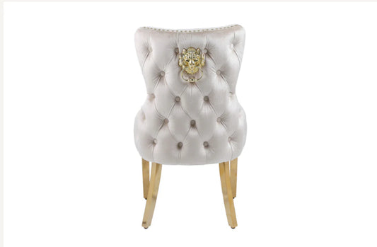 Louis Marble Gold Dining Table White + Gold Dining Chairs Black Lion Knocker