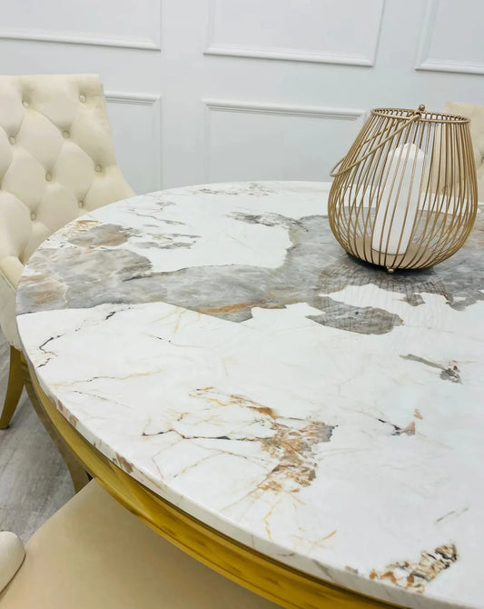 Louis 130cm Round Cream & Gold Marble Dining Table + Majestic Cream Gold Lion Knocker Dining Chairs